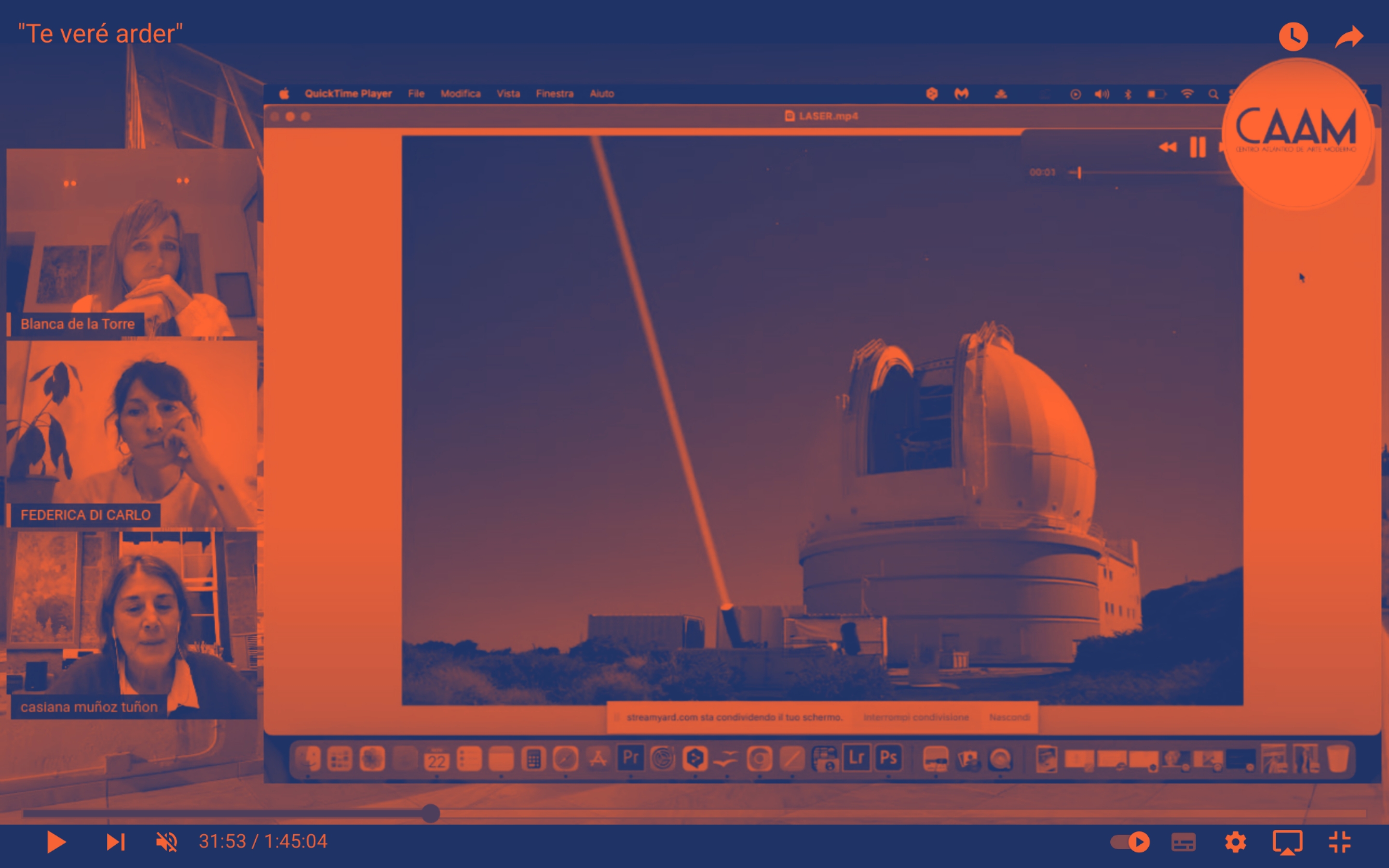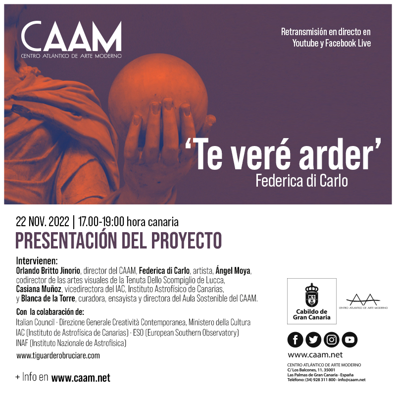 MARTEDI’ 23 NOVEMBRE, ore 18.00 Museo CAAM - Isola Canaria![]() presenta Ti Guarderò Bruciare︎ Esperimento per un dialogo #atto2con ︎Blanca de la Torre, Critica e Curatrice ︎Federica Di Carlo, artista ︎Angel Garcia Moya, Critico e curatore; Co-Dirttore della Tenuta Dello Scompiglio de Lucca ︎Casiana Muñoz Tuñon,vicedirettrice del IAC - Instituto de Astrofísica de Canarias Cosa accade quando |